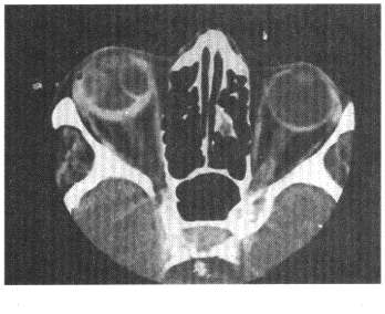 10.男,右眼外伤后视物不清,CT扫描如图所示,正确的描述或诊断是![]() |