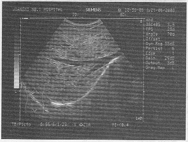 | 病史:两岁小儿,女性,腹部半年来明显膨隆,超声表现:腹腔见一巨大无回声区,其中可见分隔光带,无回声区周边可见囊壁回声,且保持连续,肠管位于无回声后方一侧,肝脏受压移位。 |