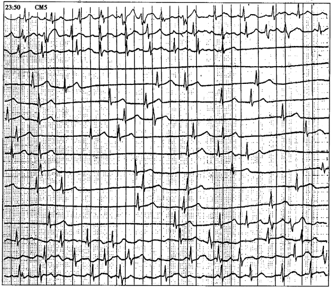 | 正确答案:A 解题思路:此图系CM5导联连续记录,为全天停搏时间最长的一次,窦性停搏达10.4s,窦性停搏后出现心房颤动。 |